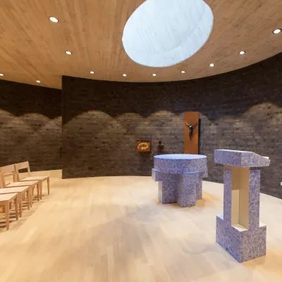 Ein wortwörtliches „Highlight“ ist der ovale Lichtschacht. Durch das Altarfenster (solche Fenster werden auch „Fenster zum Himmel“ genannt) fällt Sonnenlicht direkt auf den Altar in den ansonsten fensterlosen Raum. Ein eindrücklicher Effekt. Den auffällig blau lackierten Altar schuf der Kölner Künstler Walter Prinz aus Holz.